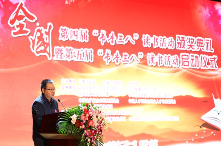 红旗出版社社长、“书香三八”读书活动组委会主任李仁国出席活动并致辞。他首先代表活动主办单位和活动组委会向参加本次活动的各位来宾、媒体朋友表示热烈的欢迎。向荣获本届活动组织奖单位和获奖个人表示热烈的祝贺。向支持承办本次大会的中华全国总工会女职工委员会和中国铁路工程总公司表示衷心的感谢。他回顾了第四届“书香三八”读书活动取得的丰硕成果,期望第五届“书香三八”读书活动有更多的单位组织,更多的女性朋友支持和参与,共同努力为倡导女性阅读,推动全民阅读,为建设书香家庭、书香社会贡献力量。